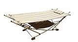 The high strength 16 x 25 mm steel frame has powder coating and strong chains that hook up on all four corners. Sturdy. No need for two trees either. Put it wherever you want. Move it into or out of the sun. It's portable.